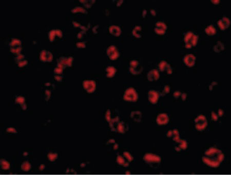 Immunofluorescence of GAPDH in HeLa cells with GAPDH antibody at 10 ug/ml.