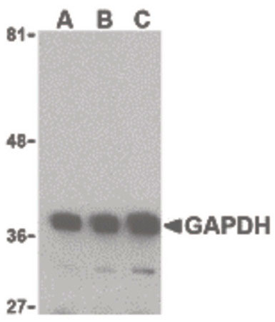 Western blot of GAPDH in HeLa cell lysate with GAPDH antibody at (A) 0.125, (B) 0.25 and (C) 0.5... |