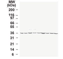 Western blot of GAPDH in the multiple human tumor cell line lysate INSTA-Blot using antibody at...