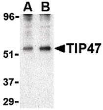 Western blot of TIP47 in EL4 cell lysate with TIP47 antibody at (A) 0.5 and (B) 1 ug/ml.