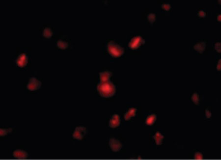 Immunocytochemistry of NUP107 in A549 cells with NUP107 antibody at 10 ug/ml.