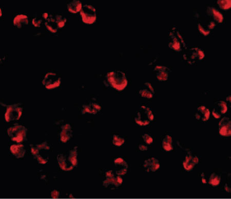 Immunofluorescence of RGS21 in HepG2 cells with RGS21 antibody at 20 ug/ml.