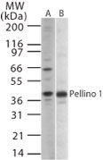 KLH-conjugated synthetic peptide corresponding to a portion of human Pellino 1 between amino acids 121-135.