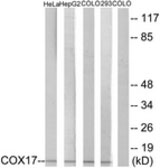 Western blot of extracts from HeLa/HepG2/COLO/293 cells, using COX17 Antibody.