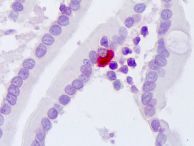 Anti-Secretin antibody IHC of human small intestine, neuroendocrine cell. |