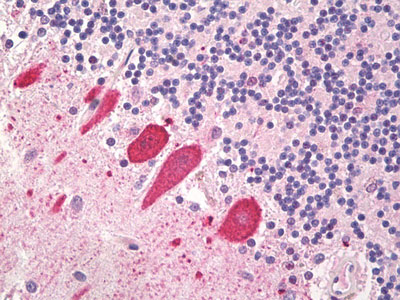 Anti-TRH antibody IHC staining of human brain, cerebellum, purkinje. |