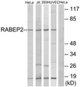 Western blot of extracts from HeLa/Jurkat/293/HUVEC cells, using RABEP2 Antibody. |