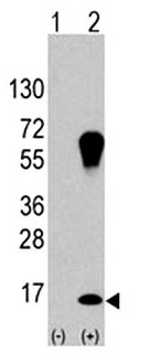 Western blot analysis of LC3 (APG8a) (arrow) using purified Pab. 293 cell lysates (2 μg/lane) either nontransfected (Lane 1) or transiently transfected with the LC3 (APG8a) gene (Lane 2) (Origene Technologies). |