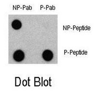 Dot blot analysis of Phospho-LC3 (APG8a) - S12 Antibody and Nonphospho-LC3 (APG8a) Antibody on nitrocellulose membrane. 50ng of Phospho-peptide or Non Phospho-peptide per dot were adsorbed. Antibody working concentrations are 0.5 μg per ml.