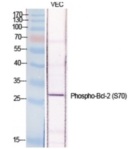 Western blot analysis in Vascula Endothelial cell line lysates. Bcl-2 was detected using the Phospho-Bcl-2(Ser70) Polyclonal purified antibody. |