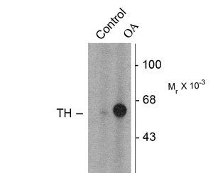 Western blot of PC-12 cells incubated in the absence (Control) and presence of okadaic acid (OA, 1 μM for 60 min) showing specific immunolabeling of the ~60k TH phosphorylated at Ser31. |