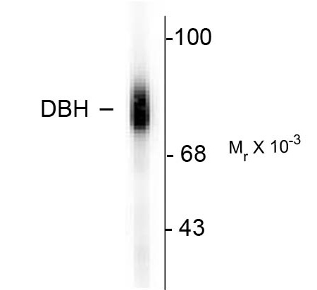 Western blot of human adrenal medulla lysate showing specific immunolabeling of the ~75k DBH protein. |