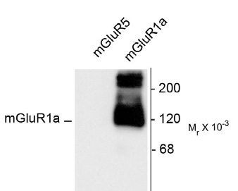 Western blot of 10 ug of HEK 293 cells expressing mGluR1a and mGluR5 showing the specific immunolabeling of the ~125k monomer and the ~250k dimer of mGluR1a. The mGluR1a antibody shows no reactivity toward mGluR5. |
