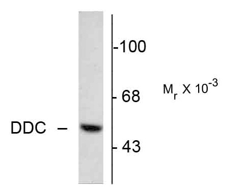 DOPA decarboxylase (aromatic L-amino acid decarboxylase, AADC; DDC) catalyzes the second reaction in the biosynthesis of catecholamines and serotonin (Waymire and Haycock, 2002; Berry et al., 1996; Haycock et al., 2003). It is also involved in the biosynthesis of trace amines. DDC antibodies can therefore be used as markers for dopaminergic, noradrenergic and serotonergic neurons in a variety of applications including depression, schizophrenia, Parkinson’s disease and drug abuse (Kish et al., 2001; Zhu et al., 2000; Zhu et al., 1999).