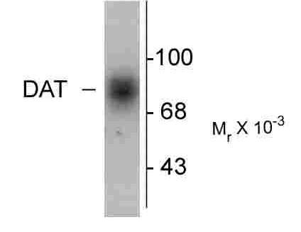 The dopamine transporter (DAT) is responsible for the reaccumulation of dopamine after it has been released. DAT antibodies and antibodies for other markers of catecholamine biosynthesis are widely used as markers for dopaminergic and noradrenergic neurons in a variety of applications including depression, schizophrenia, Parkinson’s disease and drug abuse (Kish et al., 2001; Zhu et al., 2000; Zhu et al., 1999). Levels of DAT protein expression are altered by chronic drug administration (Wilson et al., 1996).