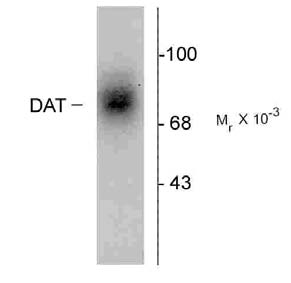 The dopamine transporter (DAT) is responsible for the reaccumulation of dopamine after it has been released. DAT antibodies and antibodies for other markers of catecholamine biosynthesis are widely used as markers for dopaminergic and noradrenergic neurons in a variety of applications including depression, schizophrenia, Parkinson’s disease and drug abuse (Kish et al., 2001; Zhu et al., 2000; Zhu et al., 1999). Levels of DAT protein expression are altered by chronic drug administration (Wilson et al., 1996).