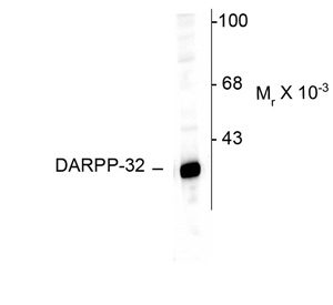DARPP-32 is a dopamine (DA) and cAMP-regulated ~32k phosphoprotein that is associated with dopaminoceptive neurons (Fienberg et al., 1998). The protein inhibits protein phosphatase I when it is phosphorylated on Thr34. In contrast, when DARPP-32 is phosphorylated on Thr75 the protein acts as an inhibitor of PKA (Bibb et al., 1999). Phosphorylation of DARPP-32 is thought to play a critical role in the regulation of dopaminergic neurotransmission. In addition, the activity of DARPP-32 is also thought to play important roles in the actions of alcohol, caffeine and Prozac? (Maldve et al., 2002; Lindskog et al., 2002; Svenningsson et al., 2002).
