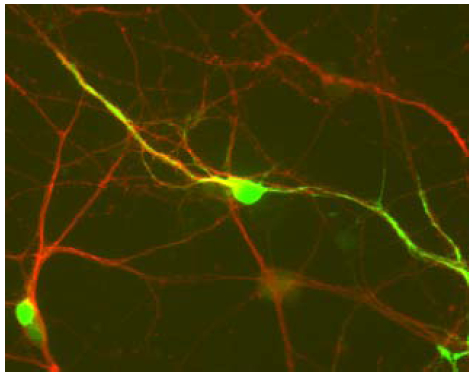 Immunochemical staining of cultured CD1 mouse striatal cells showing specific labeling ofDARPP-32 in green and Tuj1 in red. Cells and photo courtesy of QBMCellScience. |
