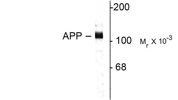 Western blot of rat hippocampal lysate showing specific immunolabeling of the ~115k APP protein. |
