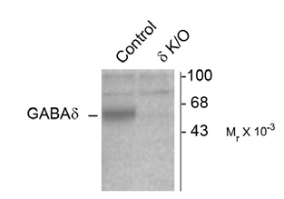 Western blot of mouse cerebellar lysates from wild type (Control) and δ-knockout (δ-K/O) animals showing specific immunolabeling of the ~52k δ-subunit of the GABAA-R. The labeling was absent from a lysate prepared from δ-knockout animals. |