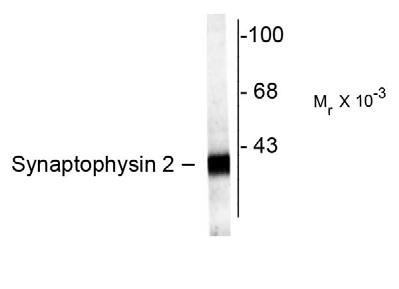 Western blot of rat hippocampal lysate showing specific labeling of the ~38k Synaptophysin2 protein. |