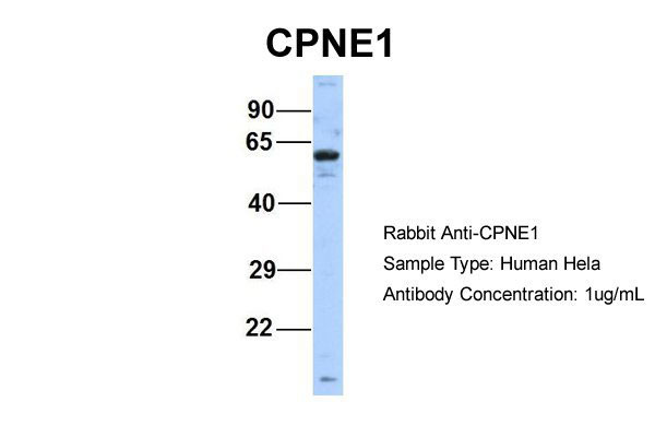 Host:Rabbit Target Name:CPNE1 Sample Tissue:Human Hela Antibody Dilution: 1.0μg/mlCPNE1 is supported by BioGPS gene expression data to be expressed in HeLa |