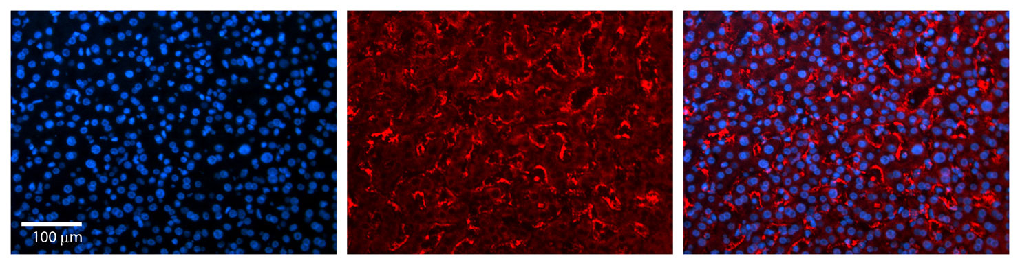 FMO3 antibody - N-terminal region Formalin Fixed Paraffin Embedded Tissue: Human Liver Tissue Observed Staining: Cytoplasm in sinusoids of liver Primary Antibody Concentration: 1:100 Secondary Antibody: Donkey anti-Rabbit-Cy3 Secondary Antibody Concentration: 1:200 Magnification: 20X Exposure Time: 0.5 - 2.0 sec