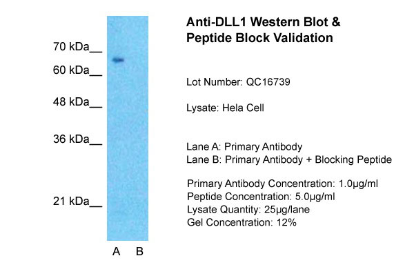 Host: Rabbit Target Name:DLL1 Sample Tissue:Hela Lane A: Primary Antibody Lane B: Primary Antibody + Blocking Peptide Primary Antibody Concentration:1μg/ml Peptide Concentration: 5μg/ml Lysate Quantity: 25ug/lane/lane Gel Concentration: 0.12 |
