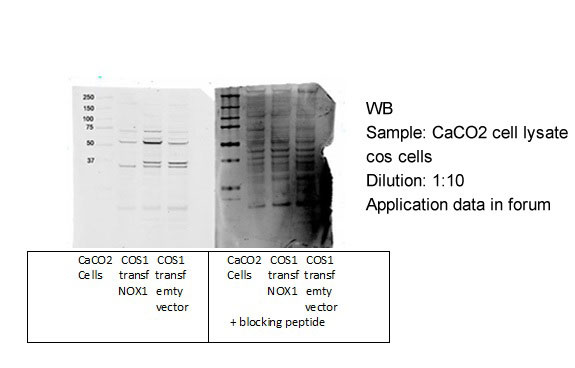 NOX1 antibody - C-terminal region validated by WB using Epithelial Colorectal Adenocarcinoma CaCO2 at 1:10. |