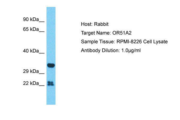 Host: Rabbit Target Name: OR51A2 Sample Tissue: RPMI-8226 Whole cell lysate s Antibody Dilution: 1.0μg/ml |