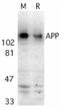 Western blot analysis of APP in mouse (M) and rat (R) brain tissue lysates with APP antibody at 2 μg/ml. |