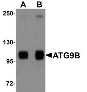 Western blot analysis of ATG9B in HeLa cell lysate with ATG9B antibody at (A) 1 and (B) 2 μg/mL. |