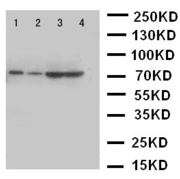 Western blot analysis with PCSK9 Antibody. Lane 1: A549 Cell Lysate; Lane 2: HeLa cell Lysate; Lane 3: U87 Cell Lysate; Lane 4: PANC Cell Lysate |
