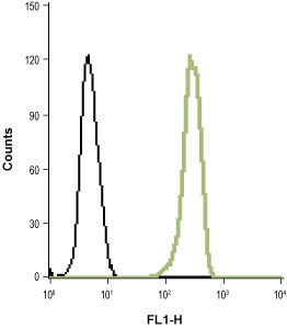 Indirect flow cytometry analysis of fixed and permeabilized HL-60 (human promyelocytic leukemia cells) cell line:Black Unstained cells + goat-anti-rabbit-FITC. Cells Anti-HVCN1 antibody ( APR16794G), (1:25) goat anti-rabbit FITC. |