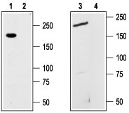 Western blot analysis of GH3 cell line (lanes 1 and 2) and mouse brain (lanes 3 and 4) lysates: 1,3. Anti-TRPM7 antibody ( APR13818G), (1:200). 2,4. Anti-TRPM7 antibody, preincubated with the control peptide antigen.