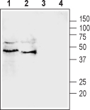 Western blot analysis of rat (lanes 1 and 3) and mouse (lanes 2 and 4) testis lysates:1, 2. Anti-Pannexin 3 antibody , (1:200).3, 4. Anti-Pannexin 3 antibody, preincubated with the control peptide antigen.
