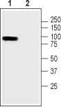 Western blot analysis of rat skeletal muscle lysate:1.Anti-Pannexin 3 antibody ( APR12715G), (1:200).2. Anti-Pannexin 3 antibody, preincubated with the control peptide antigen. |