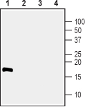 Western blot analysis of 100 ng human recombinant CDNF (lanes 1 and 3) and 100 ng human recombinant MANF (lanes 2 and 4):1,2.Anti-CDNF antibody ( AMM05739G) (1:500).3,4. Anti-CDNF antibody, preincubated with the control peptide antigen. Note that the antibody recognizes CDNF but fails to recognize closely related MANF.