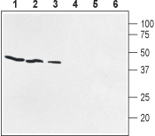 Western blot analysis of rat colon lysate (lanes 1 and 4), mouse kidney lysate (lanes 2 and 5) and human HT-29 colon adenocarcinoma cell lysate (lanes 3 and 6):1-3.Anti-Prostanoid EP1 Receptor (extracellular) antibody ( AMM07345G), (1:200).4-6. Anti-Prostanoid EP1 Receptor (extracellular) antibody, preincubated with the control peptide antigen.
