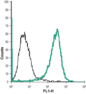Indirect flow cytometry analysis of live intact human THP-1 monocytic leukemia cell line: —— Unstained cells + goat-anti-rabbit-AlexaFluor-488. —— Cells + Anti-Prostanoid EP1 Receptor (extracellular) antibody ( AMM07345G), (1:20) + goat-anti-rabbit- AlexaFluor-488. |