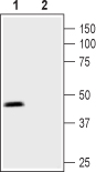 Western blot analysis of human Jurkat T-cell leukemia cell lysate:1.Anti-Prostanoid EP3 Receptor antibody ( AMM07347G), (1:400).2. Anti-Prostanoid EP3 Receptor antibody, preincubated with the control peptide antigen. |
