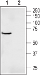 Western blot analysis of mouse kidney membranes:1.Anti-Prostanoid EP3 Receptor antibody ( AMM07347G), (1:200).2. Anti-Prostanoid EP3 Receptor antibody, preincubated with the control peptide antigen.