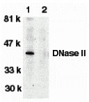 Western blot analysis of DNase II in human spleen tissue lysate in the absence (lane 1) or presence (lane 2) of blocking peptide with DNase antibody II at 1:500 dilution.