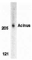 Acinus Antibody: Chromatin condensation and nuclear fragmentation (CCNF) is the hallmark of apoptosis. CCNF is triggered by the activation of members of caspase family, caspase activated DNase (CAD/DFF40), and several novel proteins including AIF and CIDE. A new inducer of chromatin condensation was recently identified and designated Acinus (for apoptotic chromatin condensation inducer in the nucleus). Acinus is cleaved by caspase-3 and an additional unknown protease generating a small active peptide p17, which causes chromatin condensation in vitro when it is added to purified nuclei. Acinus also induces apoptotic chromatin condensation in cells. Acinus is ubiquitously expressed. Three different spliced forms of Acinus have been identified in human and mouse and designated AcinusL, AcinusS and AcinusS'.