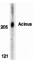 Acinus Antibody: Chromatin condensation and nuclear fragmentation (CCNF) is the hallmark of apoptosis. CCNF is triggered by the activation of members of caspase family, caspase activated DNase (CAD/DFF40), and several novel proteins including AIF and CIDE. A new inducer of chromatin condensation was recently identified and designated Acinus (for apoptotic chromatin condensation inducer in the nucleus). Acinus is cleaved by caspase-3 and an additional unknown protease generating a small active peptide p17, which causes chromatin condensation in vitro when it is added to purified nuclei. Acinus also induces apoptotic chromatin condensation in cells. Acinus is ubiquitously expressed. Three different spliced forms of Acinus have been identified in human and mouse and designated AcinusL, AcinusS and AcinusS'.