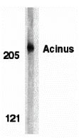 Acinus Antibody: Chromatin condensation and nuclear fragmentation (CCNF) is the hallmark of apoptosis. CCNF is triggered by the activation of members of caspase family, caspase activated DNase (CAD/DFF40), and several novel proteins including AIF and CIDE. A new inducer of chromatin condensation was recently identified and designated Acinus (for apoptotic chromatin condensation inducer in the nucleus). Acinus is cleaved by caspase-3 and an additional unknown protease generating a small active peptide p17, which causes chromatin condensation in vitro when it is added to purified nuclei. Acinus also induces apoptotic chromatin condensation in cells. Acinus is ubiquitously expressed. Three different spliced forms of Acinus have been identified in human and mouse and designated AcinusL, AcinusS and AcinusS'.
