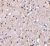 Immunofluorescence of BRSK2 in Human Brain cells with BRSK2 antibody at 20 μg/mL. |