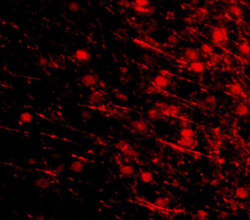 Immunofluorescence of LRFN4 in mouse brain tissue with LRFN4 antibody at 20 μg/mL. |