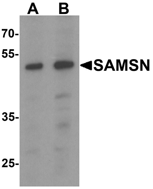 SAMSN Antibody: SAMSN (HACS1) is a member of a novel gene family of putative adaptors and scaffold proteins containing SH3 and SAM (sterile alpha motif) domains. It encodes a 441 amino acid protein that is differentially expressed in hematopoietic cells and malignancies including myeloid leukemia, lymphoma, and myeloma. SAMSN has restricted expression in human tissues. It has been shown to be up-regulated by B cell activation signals and is a participant in B cell activation and differentiation. SAMSN is an immunoinhibitory adaptor that might be a useful target for immune suppression therapy.
