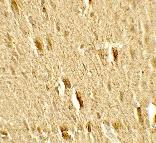 Immunohistochemistry of MFN2 in rat brain tissue with MFN2 antibody at 5 μg/mL.